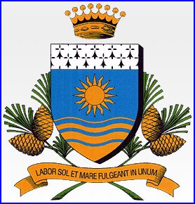 (1996) D'azur au soleil non figuré d'or; à la champagne ondée du même, chargée de trois burelles ondées d'azur de largeurs décroissantes vers la pointe, les ondes d'or de largeurs décroissantes vers le chef; le tout sommé d'un chef d'hermine.