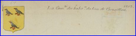 D'or à trois corneilles de sable, becquées et membrées de gueules; au chef d'azur chargé de trois fleurs de lis d'or.