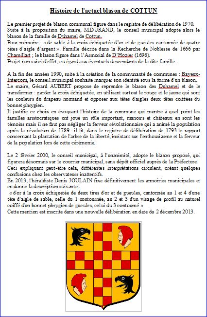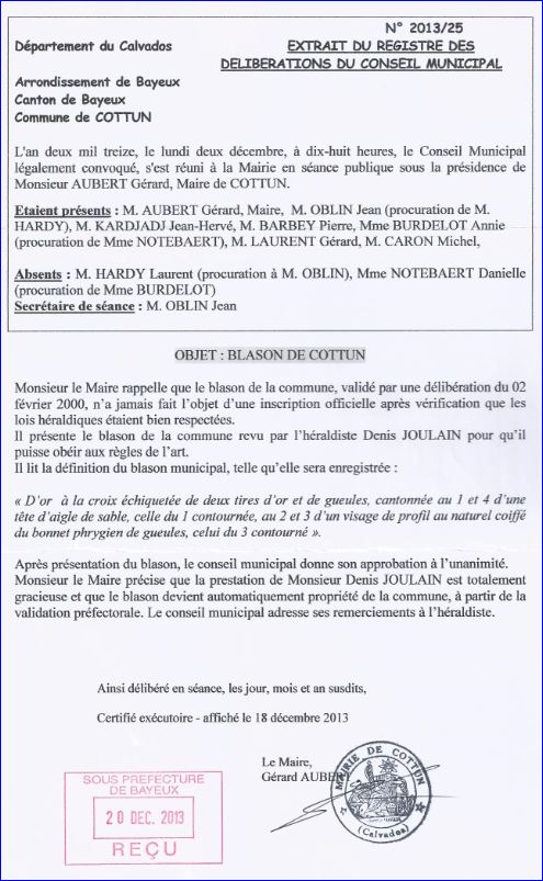 (2013) D'or à la croix échiquetée d'or et de gueules de deux tires, cantonnée aux 1er et 4e d'une tête d'aigle de sable, celle du 1er contournée, aux 2e et 3e d'une tête d'homme de profil au naturel coiffée d'un bonnet phrygien de gueules, celle du 3e contournée.