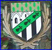 Mi-taillé: au 1er d'argent à trois arches ogivales au trait de sable, mouvant du chef et des flancs, au 2e palé de sable et d'argent; à la cotice en barre de sinople chargée de trois mouchetures d'hermine de sable; le tout sommé d'un chef d'or semé de feuilles de chêne de sinople.