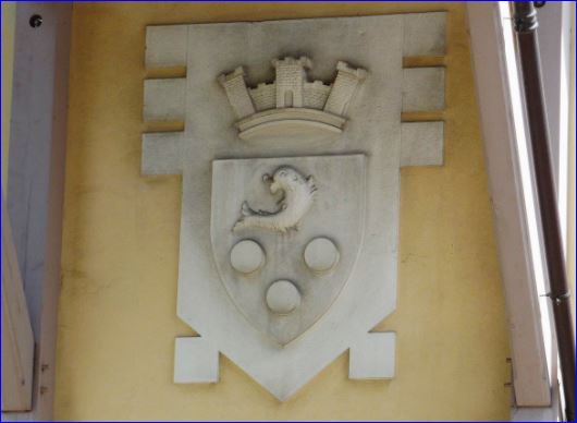 D'azur à trois besants d'or; au chef d'or chargé d'un dauphin d'azur barbé, crêté, oreillé, peautré et lorré de gueules.