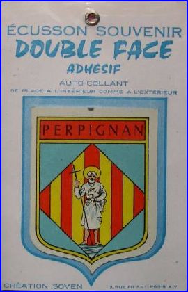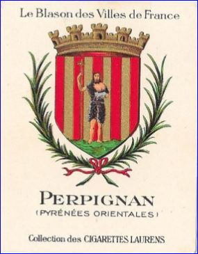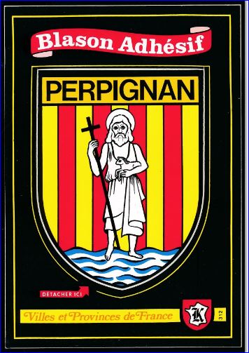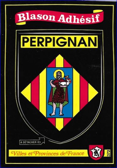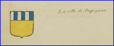 (1400) Écu en losange. D'or à quatre pals de gueules; à l'écusson en bannière d'azur brochant sur le tout, chargé de saint Jean Baptiste debout de carnation, auréolé d'or, vêtu d'une tunique en poils de chameau serrée à la taille d'une ceinture de cuir, le tout au naturel, et d'un manteau de pourpre doublé de sinople, tenant de sa dextre une croix haute d'or et sur son bras senestre un agnelet d'argent.