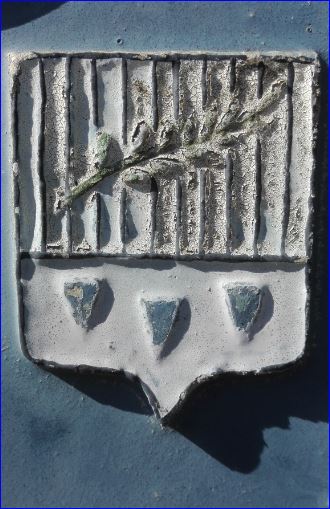 Coupé: au 1er d'argent à dix filets en pal de sable, au rameau d'olivier (à la palme) de sinople brochant en barre, au 2e d'azur à trois coins de bûcheron d'or.