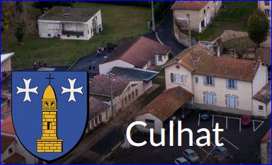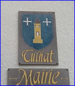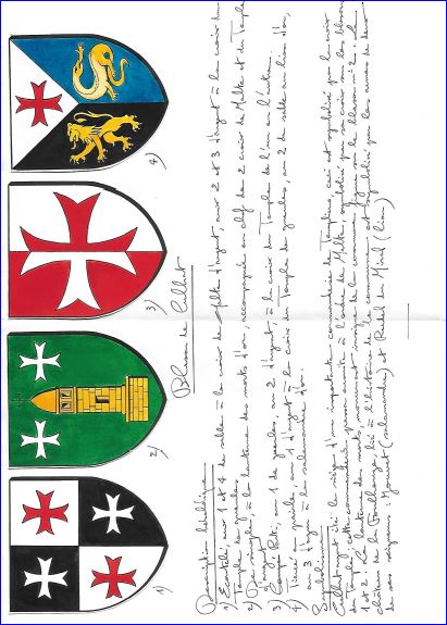 (1981) D'azur à la lanterne des morts du lieu d'or, maçonnée de sable, accompagnée en chef de deux croix templières d'argent.