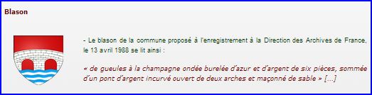 (1988) De gueules au pont courbe, ouvert de deux arches, d'argent, maçonné de sable, posé sur une champagne fascée ondée d'azur et d'argent.