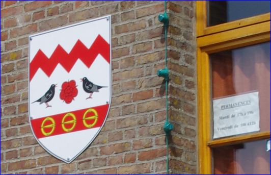 (2012) D'argent à la fasce vivrée de gueules en chef et à la fasce du même chargée de trois fermaux d'or en pointe, lesdites fasces accompagnées en coeur d'une rose de gueules accostée de deux merles chantants affrontés de sable becqués et membrés du second.