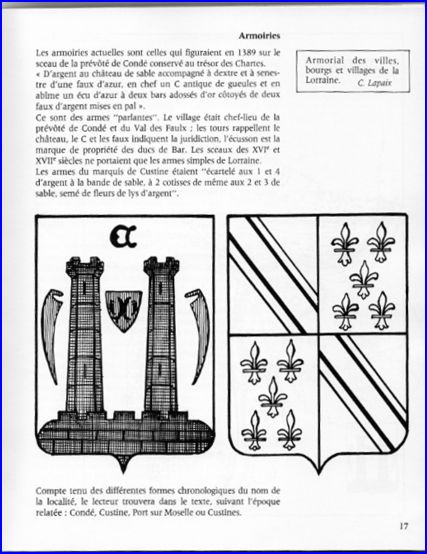 1) D'or au château constitué de deux tours hautes de sable, mouvant d'un mur crénelé du même, lui-même mouvant de la pointe, lesdites tours accompagnées, en cœur, d'un écusson d'azur à deux bars adossés d'or et côtoyés de deux fers de faux d'argent, aux flancs, de deux fers de faux d'azur affrontés en pal et, au point du chef, de la lettre capitale gothique C de gueules.
