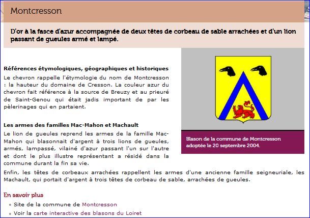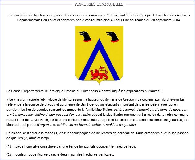 (2004) D'or au chevron d'azur accompagné en chef de deux têtes de corbeau arrachées de sable et d'un lion léopardé de gueules en pointe.