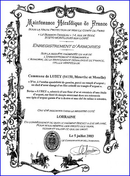 Brevet d'armoiries, aimablement transmis par Dominique Larcher.