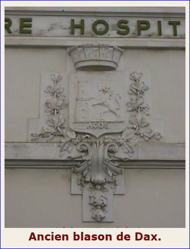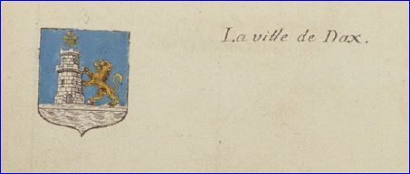 (1809) D'azur à la tour donjonnée d'argent, ouverte, ajourée et maçonnée de sable, surmontée d'une fleur de lis d'or et soutenue à senestre d'un lion du même, le tout sur une terrasse d'argent, elle-même sur une rivière ondée du même mouvant de la pointe et chargée des lettres capitales A, C, Q et S de sable.