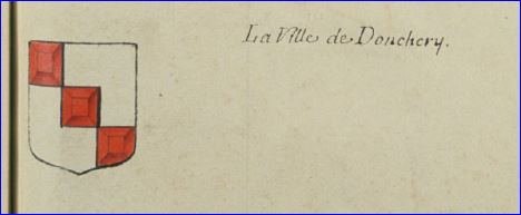 De gueules à deux râteaux démanchés d'or, soutenus de la lettre capitale D du même.