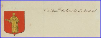 Tiercé en pal: au 1er d'azur à la fasce losangée d'argent et de sinople, au 2e de gueules à saint Andéol d'or, au 3e de sinople à la fasce losangée d'or et d'azur.