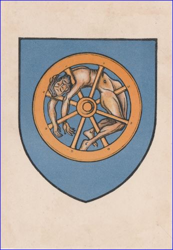 (1263, 1912) D'azur à la roue d'or dans les rais de laquelle est attaché un homme de carnation, vêtu d'un pagne d'argent et nimbé d'or.
