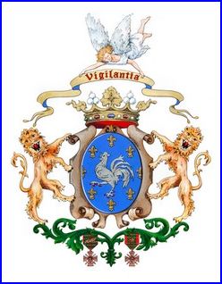 Écu ovale: D'azur au coq hardi d'argent, armé de gueules, accompagné de huit fleurs de lis d'or, ordonnées en orle, les deux des flancs mouvant à demi des bords de l'écu.