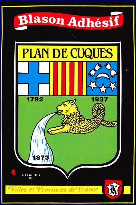 De sinople à la fontaine d'or à la forme d'un lion dragonné accroupi d'or, crachant une gerbe d'eau d'argent chargée en pointe du millésime 1873 d'azur; le tout surmonté d'un chef tiercé en pal au I d'argent à la croix d'azur chargé en pointe du millésime 1792 d'or brochant sur le tout, au II d'or à quatre pals de gueules, au III d'azur au croissant renversé d'argent, accompagné en pointe de trois étoiles de même ordonnées 2 et 1, et en chef de deux vols d'argent renversés et affrontés en chevron, chargé en pointe du millésime 1937 d'or.
