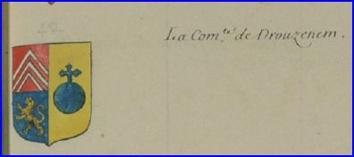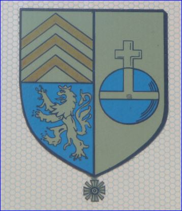 Parti: au 1er coupé au I d'or à trois chevrons de gueules et au II d'azur au lion d'or, lampassé de gueules, au 2e d'or au globe d'azur cintré et croiseté du champ.