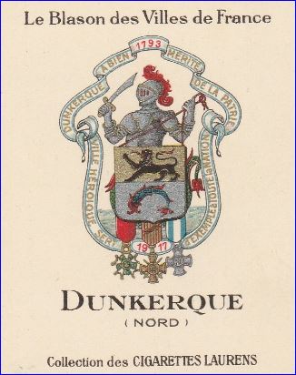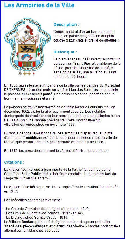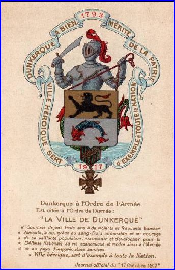 Devise: «1793 - Dunkerque a bien mérité de la patrie - 1917-1940 - Ville héroïque, sert d’exemple à toute la nation».