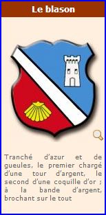 Tranché: au 1er d'azur à la tour d'argent, au 2e de gueules à la coquille d'or; à la cotice d'argent brochant sur la partition.