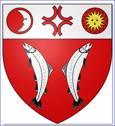 De gueules à deux saumons adossés d'argent; au chef du même chargé d'une croix formée de quatre moitiés d'annelet accolées de gueules, accompagnée de deux tourteaux du même, chargés, celui de dextre, d'une lune en décours d'argent et, celui de senestre, d'un soleil d'or.