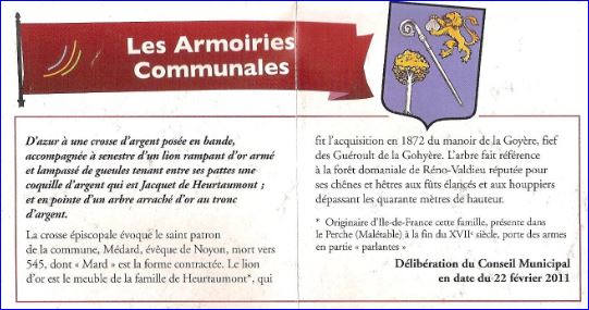 (2011) D'azur à la crosse de saint-Médard d'argent posée en bande, accompagnée, en chef, d'un lion d'or armé et lampassé de gueules, tenant une coquille d'argent entre ses pattes, et, en pointe, d'un hêtre d'or, fûté et arraché d'argent.