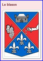 (1961) Écartelé en sautoir: au 1er d'azur au donjon d'argent, au 2e de gueules à la grappe de raisin, tigée et feuillée d'argent, au 3e de gueules au dextrochère d'argent vêtu d'azur semé de fleurs de lis d'or, duquel tombent deux gouttes d'argent, au 4e d'azur à trois fleurs de lis d'or mal ordonnées.