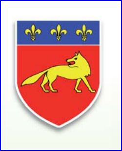 (1982) De gueules au loup contourné d'or, denté d'argent et regardant à dextre; au chef cousu d'azur chargé de trois fleurs de lis d'or.