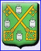 De sinople à deux clefs d'or passées en sautoir, accompagnées de quatre clarines d'argent.