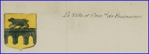 De gueules à la champagne d'azur, au pont droit, crénelé, de trois arches d'argent, maçonné de sable brochant, sommé de deux cygnes adossés d'argent, supportant un écusson d'azur à trois fleurs de lis d'or brisé d'un lambel d'argent.