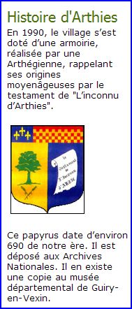 (1990) Parti: au 1er d'or à l'arbre de sinople soutenu de deux épis de blés, tigés et feuillés du même, passés en sautoir, au 2e d'azur au parchemin d'argent chargé de l'inscription « Le testament de l'Inconnu d'ARTHIES » en lettres de sable; au chef échiqueté d'or et de gueules de quatre tires et au chef de gueules; au franc-canton d'azur chargé de trois fleurs de lis d'or mal ordonnées.