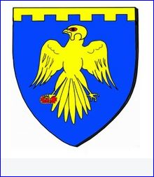 (2012) D'azur au faucon éployé d'or, allumé de gueules, empiétant dans sa serre dextre un rubis de gueules serti d'or; au comble bastillé de quatre pièces et deux demies d'or.