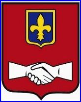 De gueules à la foi alésée et abaissée d'argent, surmontée d'un écu d'azur chargé d'une fleur de lis d'or et à la filière du même.