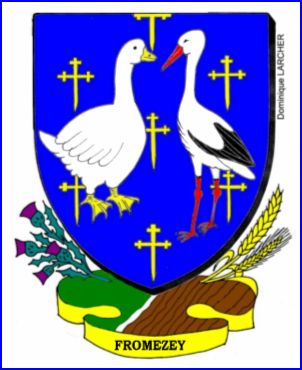 (2011) D'azur semé de croix recroisetées au pied fiché d'or; à une oie contournée d'argent, becquée et membrée d'or et à une cigogne au naturel affrontée avec l'oie, brochant sur le tout.