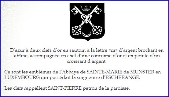 D'azur à deux clefs d'or en sautoir, à la lettre «m» d'argent brochant en abîme, accompagnée en chef d'une couronne d'or et en pointe d'un croissant d'argent.