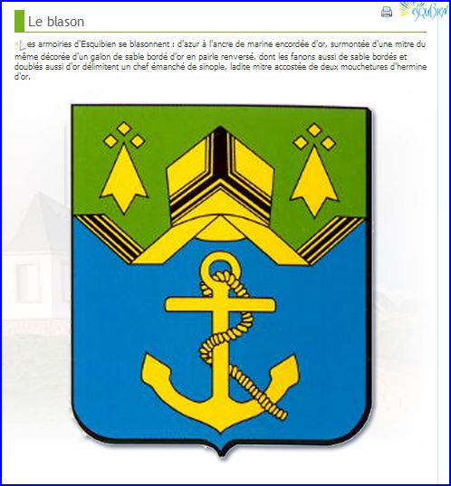 (1992) D'azur à l'ancre de marine encordée d'or, surmontée d'une mitre du même décorée d'un galon de sable bordé d'or en pairle renversé, dont les fanons de sable bordés et doublés d'or délimitent un chef émanché de sinople chargé de deux mouchetures d'hermine d'or accostant ladite mitre.