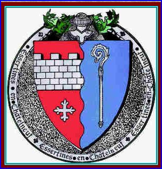Parti ondé: au 1er de gueules à la fasce crénelée haussée d'argent, maçonnée de sable et soutenue d'une croisette fleurdelisée d'argent, au 2e d'azur à la crosse d'argent.