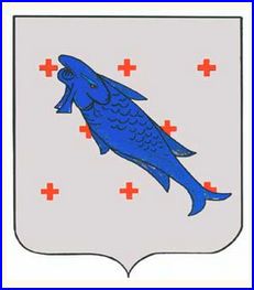 D'agent à huit croisettes de gueules, ordonnées 3, 2 et 3; au bar d'azur, allumé de gueules et brochant en bande.