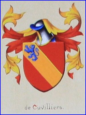 De gueules à la bande d'or, chargée en chef d'un lion d'azur, armé et lampassé de gueules, posé à plomb.