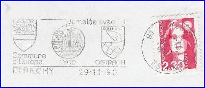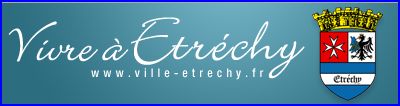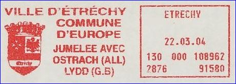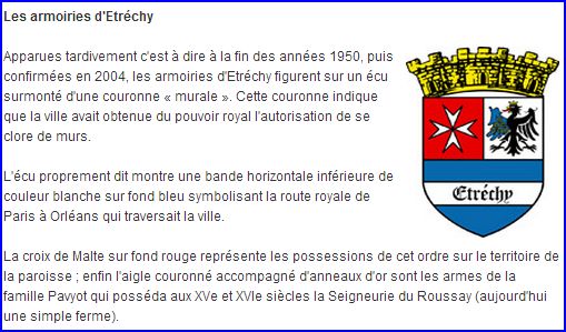 (1959) Coupé: au 1er parti au I de gueules à la croix de Malte d'argent, au II d'argent à l'aigle au vol abaissé de sable, lampassée de gueules, armée becquée et couronnée d'or à l'aile dextre d'azur chargée de six annelets d'or, ordonnés 1, 2 et 3, au 2e d'azur à la fasce d'argent chargée de l'inscription « Etréchy » de sable.