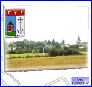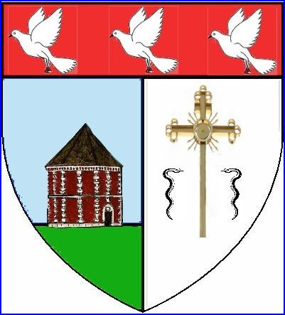 (2009) Parti: au 1er d'azur au colombier [de la Ferme de la Bataille] de gueules aux colombages d'argent, essoré et ouvert à senestre de sable, posé sur une terrasse de sinople, au 2e d'argent à la croix de procession tréflée [orthodoxe de saint Samson] d'or, accostée en pointe de deux serpents ondoyants en S et affrontés en pal de sable; le tout sommé d'un chef de gueules chargé de trois colombes essorantes d'argent.