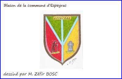 Tiercé en pairle: au 1er de sinople plain, au 2e de gueules au pèlerin de Saint-Jacques-de-Compostelle au naturel, contourné, sur une terrasse herbée et isolée de sinople, au 3e d'or à la croix de pierre du lieu au naturel sur une terrasse herbée et isolée de sinople; au chevronnel versé et combiné à une vergette d'azur brochant sur la partition et le 1er; à la divise alésée d'or, mouvant du trait du chef et chargée de l'inscription « ESPAIRAC » de sable.