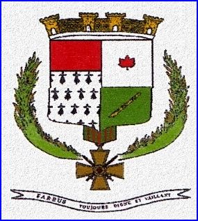 (1984) Parti: au 1er d'hermine, au chef de gueules, au 2e coupé au I d'argent à la feuille d'érable de gueules, au II de sinople au bâton de pèlerin d'or posé en barre.