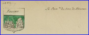 De sinople au bourg composé d'une église et de plusieurs maisons d'argent, essorées et ajourées de sable, senestré d'un grand rocher d'argent du milieu duquel sort une rivière du même, coulant entre le bourg et le rocher; au chef d'argent chargé de l'inscription « FAUCON » en lettres capitales de sable.