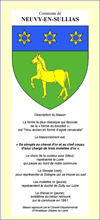 (2014) De sinople au cheval passant d'or; au chef cousu d'azur chargé de trois molettes d'or.