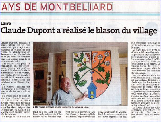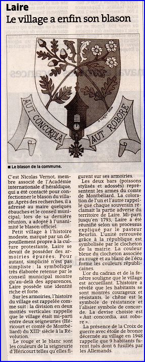 (2013) Parti d'argent et de gueules, à deux branches de sinople, passées en sautoir et mouvant chacune d'un angle de la pointe, brochant sur le parti, celle en bande de chêne fruitée de trois pièces d'or, les cupules de gueules, celle en barre d'alisier torminal fleurie de trois pièces d'argent, boutonnées d'or, le tout accompagné en chef de deux bars adossés de l'un en l'autre et en pointe du clocheton de la mairie du lieu sommé de son coq, le tout d'azur, mouvant de la pointe et brochant sur le parti, ajouré d'or, le cadran d'horloge du même.