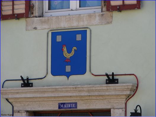 D'azur au coq d'or, crêté, barbé et membré de gueules, accompagné de trois écussons d'argent.