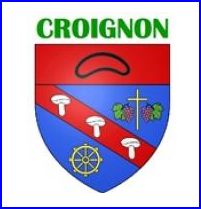 D'azur à la bande cousue de gueules chargée de trois champignons d'argent posés à plomb, accompagnée en chef d'une croix latine d'or accostée de deux grappes de raisin cousues de pourpre, tigées et feuillées de sinople, et en pointe d'une roue de moulin d'or; au chef cousu de gueules chargé d'un crougnon [anneau d'un joug de boeuf] de sable.