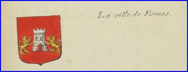 Écartelé: aux 1er et 4e de gueules, au sénestrochère d'argent tenant une épée et surmonté d'un casque taré de profil, le tout du même, aux 2e et 3e burelé d'argent et d'azur, à trois chevrons de gueules, le premier écimé brochant sur le tout; sur le tout, d'or à trois chevaliers armés en ombre de sable, à la bordure d'or portant l'inscription en lettres latines de sable « SIGILL. MAIORIS:ET IVRATORIVD COMMVDIE DE FISMES ».