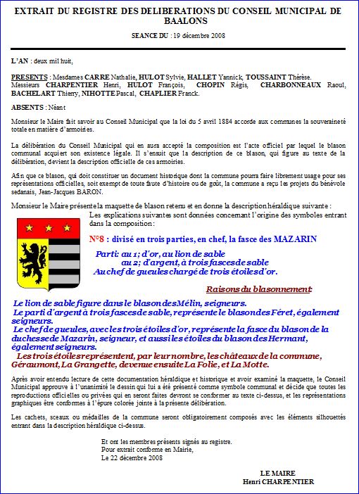 (2008) Parti: au 1er d'or au lion de sable, au 2e d'argent à trois fasces de sable; le tout sommé d'un chef de gueules chargé de trois étoiles d'or.