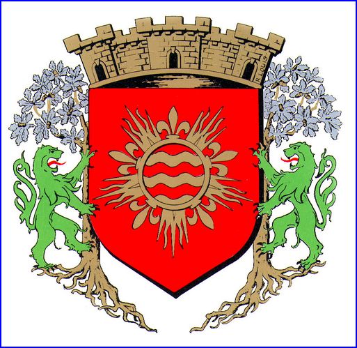 De gueules à la fontaine héraldique fascée ondée de gueules et d'or, dans un anneau supportant cinq fleurs de lis alternant avec cinq faisceaux de cinq rayons de soleil, le tout d'or.