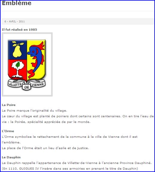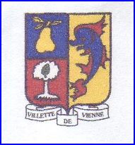 (1985) Parti: au 1er coupé au I d'azur à la poire feuillée de trois pièces d'or, au II de gueules à l'orme d'argent, le feuillage chargé d'une feuille de sinople posée en pal, au 2e d'or au dauphin d'azur crêté, barbé, lorré, peautré et oreillé de gueules.